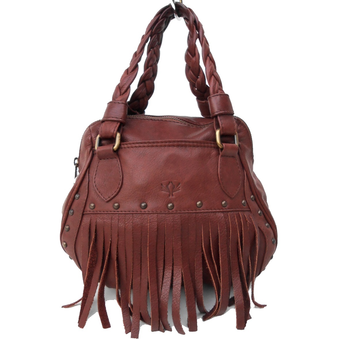 > 良好 正規 STEPHEN ステファン 牛革レザー 茶 フリンジxスタッズ装飾 ハンドバッグ イタリア製 ブラウン BROWN ショルダー カウレザー 本革