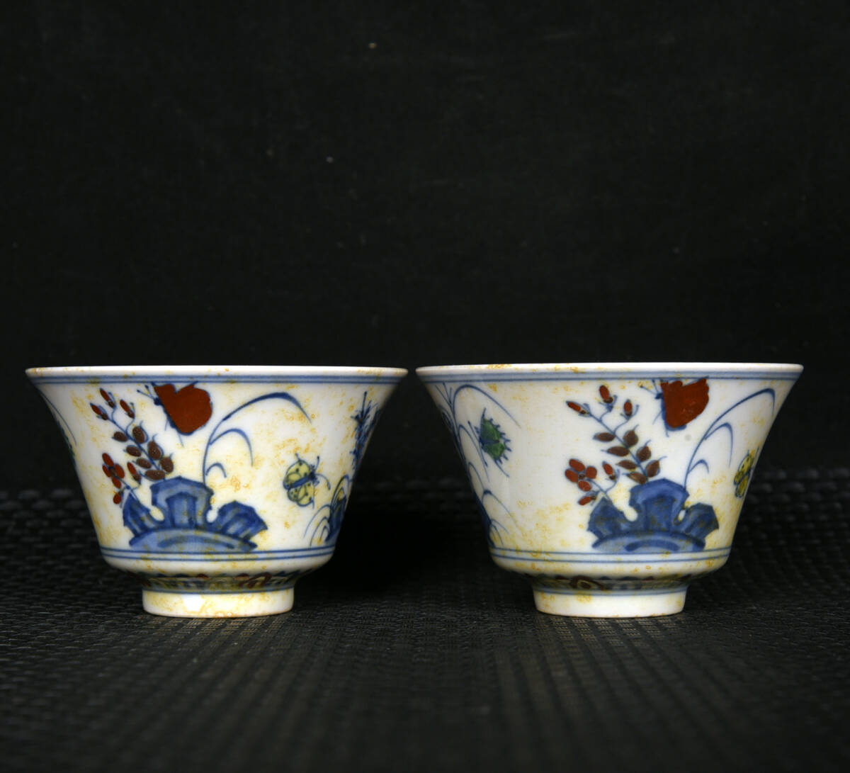 - ■NA102■大明成化年制 闘彩萬字款 三秋杯2客 時代物 古玩 唐物 古陶磁器■