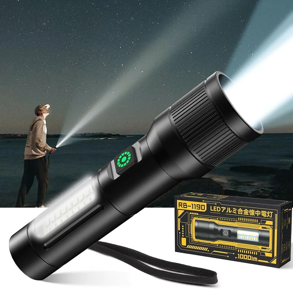 - 高輝度1000ルーメン LED懐中電灯 USB充電・防災 アウトドアに最適! ledライト 6モード調光 白色と赤色COB作業灯