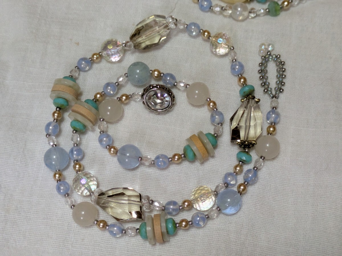 - 海色キラキラロングネックレス ハンドメイド 手作り 高木洋恵デザイン ビーズ コスチュームジュエリー 115cm 2連 ボタン留め エレガント