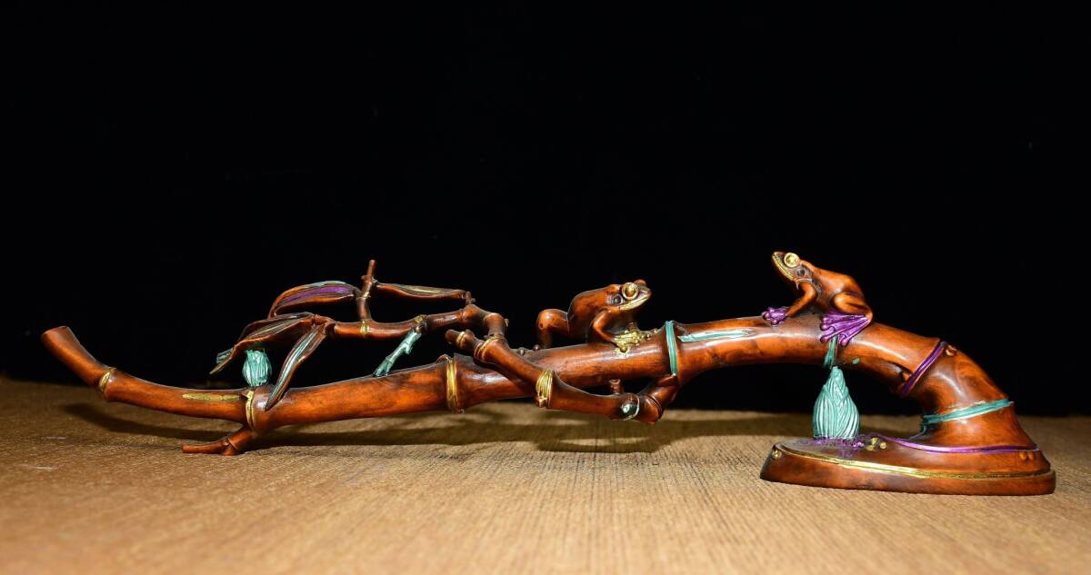 - 蔵友旧蔵出 小葉黄楊木製 細密彫 彩繪 青蛙筆架 文房具 供養品 置物擺件 稀少珍藏品 古賞物 中国古玩 中国古美術品