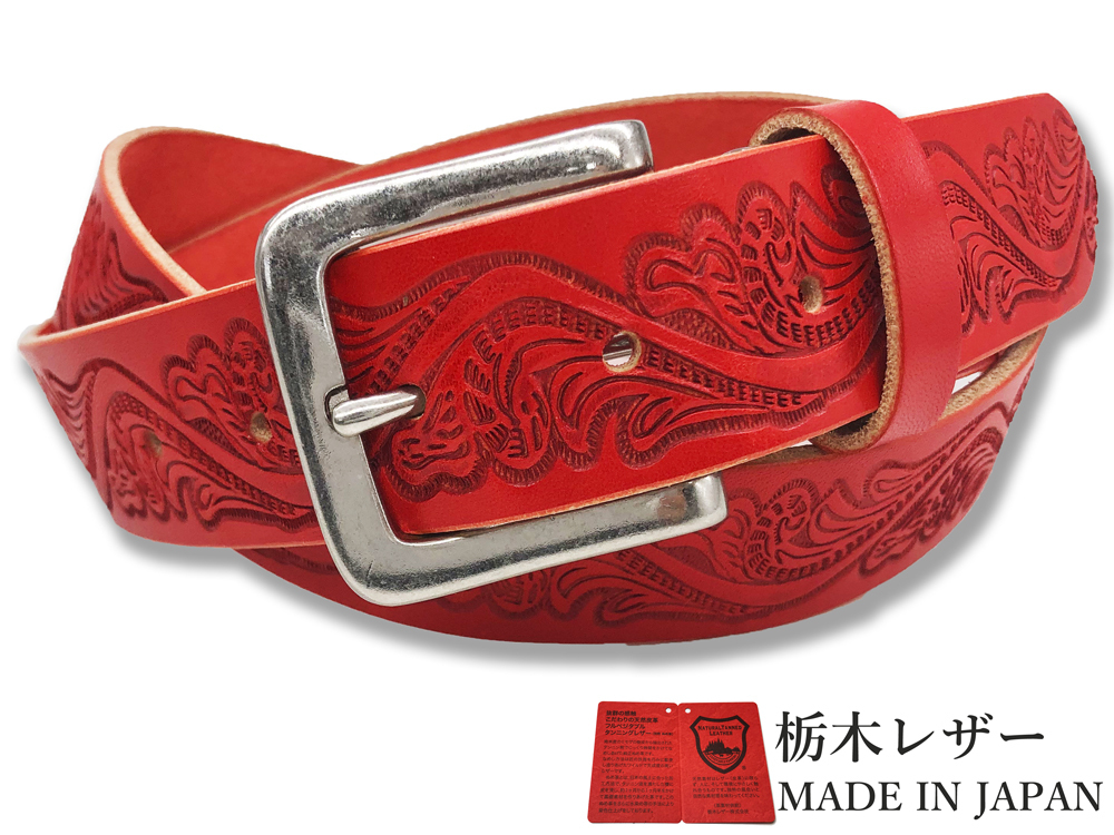 - 訳あり 新品 アウトレット B品 栃木レザーベルト Lサイズ 牛革 本革 メンズ カジュアル 国産 35mm 型押し 赤 レッド w004b-L-RD