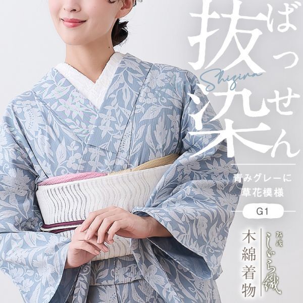 - 【阿波しじら】洗える着物『お仕立て代込み』 抜染 【青みグレーに草花模様】 12m 女性用 木綿 抜染 夏着物 浴衣 レディース No.G01