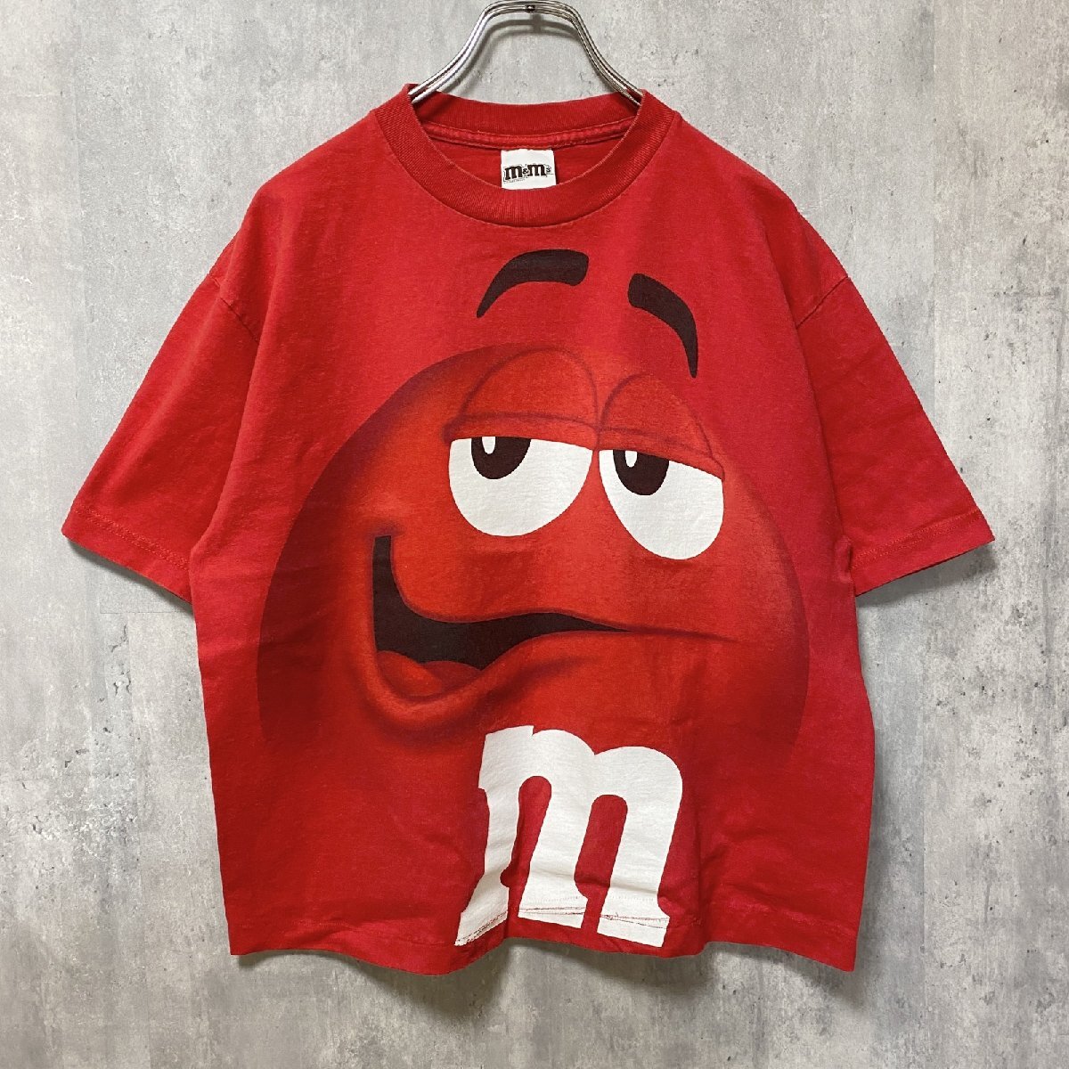 > 古着 used M&M’s 半袖オフィシャルプリントTシャツ ショート丈 赤 レッド レトロ お菓子 チョコレート Lサイズ