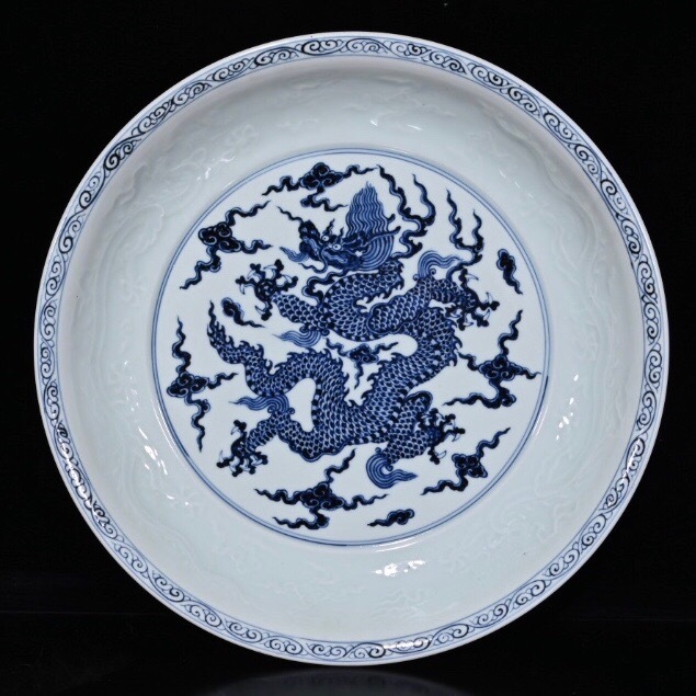 - ▽鴻▽ 明 宣德年製款 古陶瓷品 青花 云龍紋 供盤 陶藝 古賞物 古董品 時代物 稀少珍品 中国古玩 中国古美術