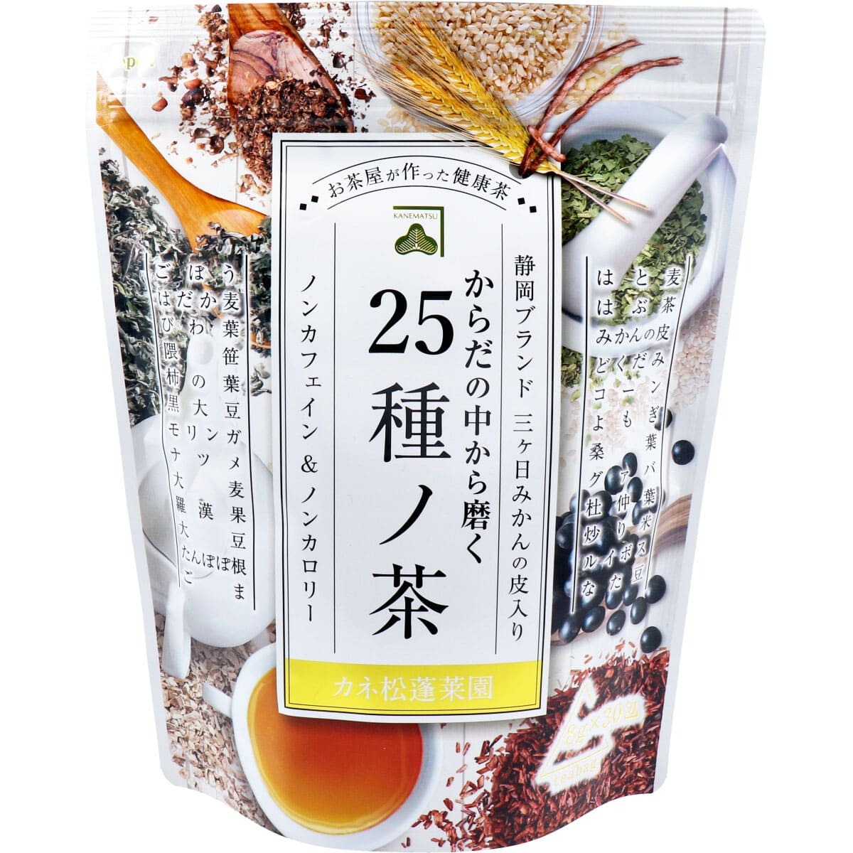 ▼▼▼▼▼▼注意事項▼▼▼▼▼▼・送料込み(送料700円が商品価格に含まれています) 一部地域では追加送料あり。・お取り寄せ商品です。弊社にて手配後、メーカー・卸業者からの直送になります。・まれにメーカー欠品、出荷遅延等が発生致します。問題発生時は別途メールにてご連絡致します。・配送方法の指定、日時指定、置き配、ギフト対応、他商品との同梱配送などは対応できません。・まとめ買いや複数購入の場合は通常より発送に時間が掛かる場合がございます・複数個口の場合、2階以上への搬入ができない場合があります。(その場合は1階での受け渡しとなります)・大型連休、お盆、年末年始などは発送をお休みさせていただく場合がございます・メーカー都合により、パッケージは予告なく変更される場合がございます・梱包用のダンボールはリサイクル品を使用させていただきます。・注文に関するご連絡(注文確定通知・発送通知など)はメールでご案内させていただきます※商品ページの内容について、少しでもご不明な点などがございましたら購入前に一度ご連絡ください▲▲▲▲▲▲注意事項▲▲▲▲▲▲〇商品説明おいしく健康に♪お茶のプロが厳選した25種の健康成分がたっぷり!クセも少なく三ケ日みかんのほどよい香りをお楽しみいただけます。●甘味があってスッキリ飲みやすく、美味しいから毎日飲んでも飽きのこない味わいで、ほっとしたひといきを与えてくれます。●茶がらを捨てる手間が省けて簡単に扱えるティーバッグタイプ。忙しい最中でも手軽にお茶がいれられます。●食物繊維たっぷり、無添加。静岡ブランド「三ケ日みかん」の皮を使用しています。●ノンカフェイン&ノンカロリーです。●HOT・ICE両用タイプ:HOTで抽出後冷たくしても美味しくお飲みいただけます。●1包でたっぷり1リットル分です。【名称】混合茶(ティーバッグ)【原材料】はと麦(国産)、はぶ茶、みかんの皮、どくだみ、コーン、よもぎ、桑葉、グァバ、杜仲茶、炒り米、ルイボス、なた豆、ごぼう、はだか麦、びわ葉、隈笹、柿の葉、黒大豆(大豆)、モリンガ、ナツメ、大麦、羅漢果、大豆、たんぽぽ根、ごま【保存方法】高温・多湿を避け、移り香にご注意ください。【おいしい飲み方】(1)ティーポットに1包を入れ熱湯を注ぎます。(2)お好みにより4〜5分程度蒸らします。(3)温めたカップに最後の1滴まで注ぎます。※熱湯には十分ご注意ください。★アイスもおいしい(1)耐熱ポットにお湯1Lとティーバッグ1〜2包を入れ、お箸等でよくかき混ぜます。(2)冷蔵庫で約3〜4時間冷やし、氷の入ったグラスに注ぎお召し上がりください。※なるべく早くお召し上がりください。【栄養成分(ティーバッグ1包当たり)】★茶葉(8g当たり)エネルギー:29.8kcaLタンパク質:1.03g脂質:0.45g炭水化物:5.41g食塩相当量:0gカフェイン:0mg★抽出液(100mL当たり)エネルギー:0kcaLタンパク質:0g脂質:0g炭水化物:0g食塩相当量:0gカフェイン:0mg【アレルギー物質】大豆、ごま【注意】・お茶は鮮度が大切です。開封後はお早めにお飲みください。〇商品仕様個装サイズ:200X260X75mm個装重量:約263g内容量:240g(8g×30包入)製造国:日本【発売元:カネ松製茶株式会社】(出典:カネ松製茶)
