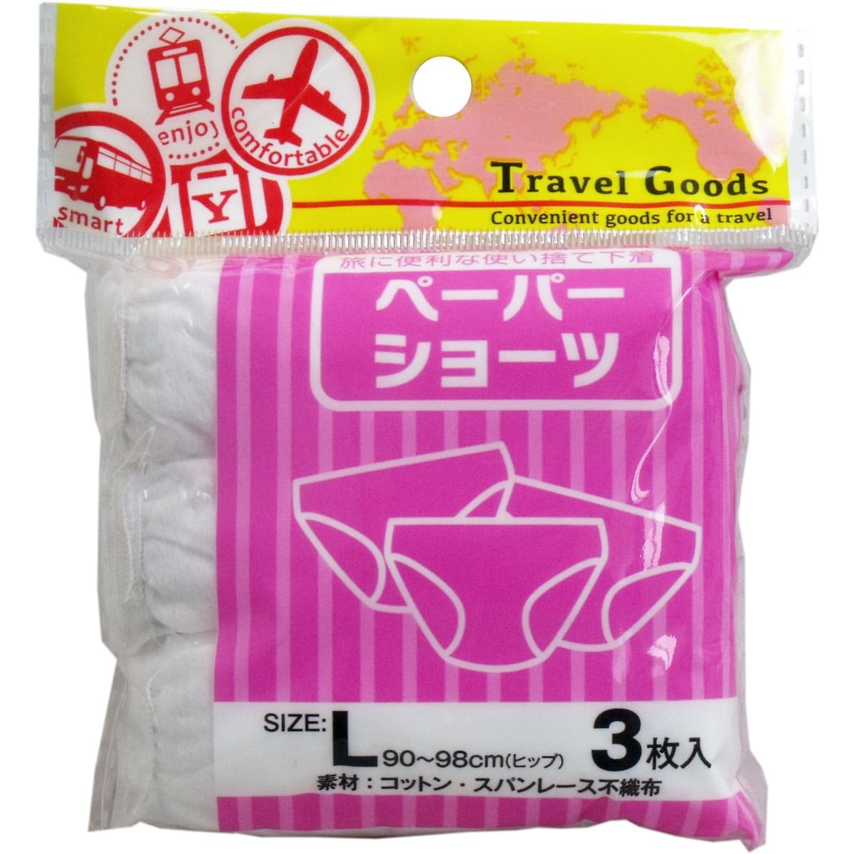 ▼▼▼▼▼▼注意事項▼▼▼▼▼▼・送料込み(送料700円が商品価格に含まれています) 一部地域では追加送料あり。・お取り寄せ商品です。弊社にて手配後、メーカー・卸業者からの直送になります。・まれにメーカー欠品、出荷遅延等が発生致します。問題発生時は別途メールにてご連絡致します。・配送方法の指定、日時指定、置き配、ギフト対応、他商品との同梱配送などは対応できません。・まとめ買いや複数購入の場合は通常より発送に時間が掛かる場合がございます・複数個口の場合、2階以上への搬入ができない場合があります。(その場合は1階での受け渡しとなります)・大型連休、お盆、年末年始などは発送をお休みさせていただく場合がございます・メーカー都合により、パッケージは予告なく変更される場合がございます・梱包用のダンボールはリサイクル品を使用させていただきます。・注文に関するご連絡(注文確定通知・発送通知など)はメールでご案内させていただきます※商品ページの内容について、少しでもご不明な点などがございましたら購入前に一度ご連絡ください▲▲▲▲▲▲注意事項▲▲▲▲▲▲〇商品説明海外・国内旅行に最適!携帯に便利!●旅行中、重たい荷物を持っての連日移動は考えただけでユウウツ。ペーパーショーツなら手の平サイズでスマートに捨てられます。●急なお泊り、スポーツジムの着替えに、いつものバッグに入れておくと便利。また忙しくて洗濯ができない時にも便利です。【Lサイズ】ヒップ・・・90〜98cm【素材】コットン・・・20%スパンレース不織布・・・80%【注意】・トイレに捨てないでください。・高熱を避けてください。・本商品は使い捨てを前提に開発された物です。長期に渡り使用したり、繰り返し洗濯すると破れる場合がありますのでおやめください。・廃棄の際は各自治体の廃棄区分に従ってください。〇商品仕様個装サイズ:120X135X30mm個装重量:約40g内容量:3枚入製造国:中国【発売元:ヨック株式会社】(出典:ヨック)