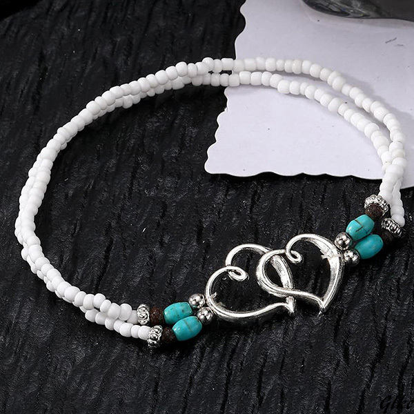 - 【金属アレルギーにも配慮されていて安心】 アンクレット レディース おしゃれ 足元 ハートチャーム ターコイズ リゾート風 ホワイトビーズ
