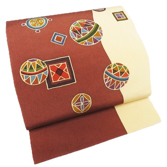 - 名古屋帯 なごや帯 中古 リサイクル 正絹 カジュアル 仕立て上がり 作家物 落款 縮緬地 毬の図 茶色 枯色 多色 きもの北條 A1249-16