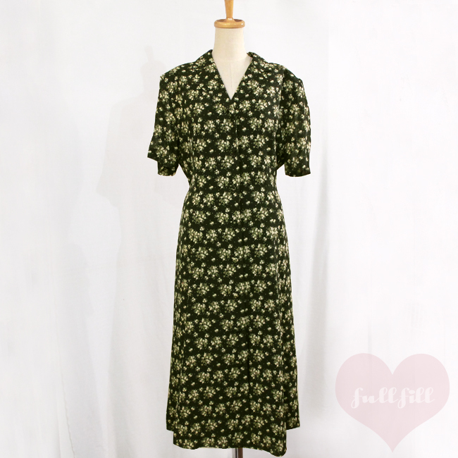 > 古着 ワンピース 昭和 レトロ ロング ブラック 花柄 ヴィンテージフラワー モード ビンテージ 開襟シャツ used レディース古着 vintage