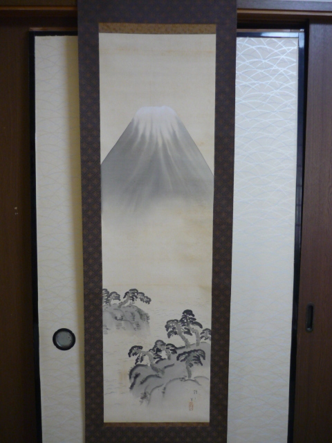 - 【模写】 掛軸 石井鶴三 富士山と松 絹本 大きさ全体約192cmx47.5cm 絹本部分約123.5cmx35cm 合わせ箱あり