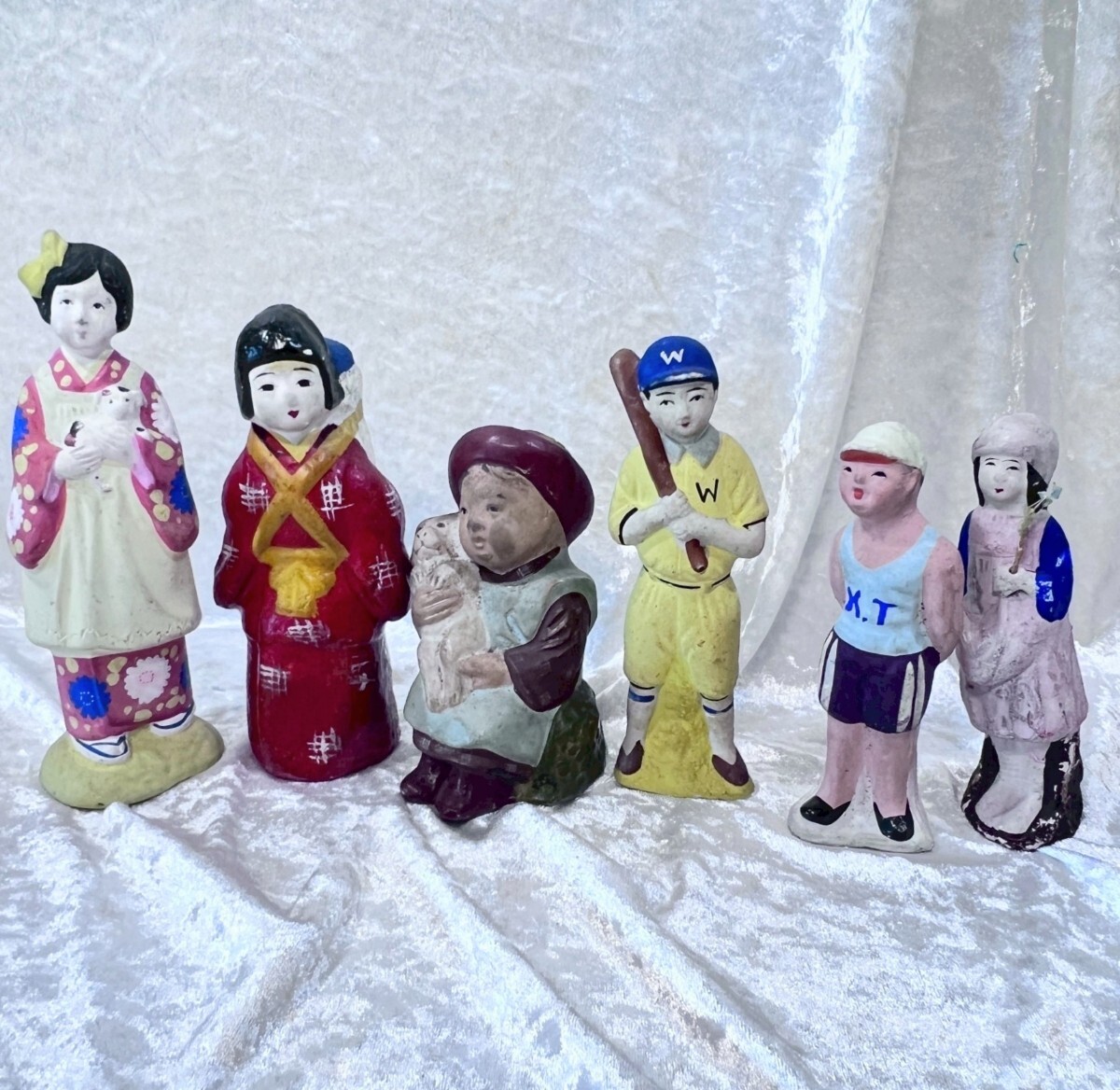 - 【フィギュア・人形・ドール】土人形6個セット⑧ 女の子3個 男の子3個 彩色 昭和レトロ ディスプレイ用品 インテリア 骨董品 アンティーク