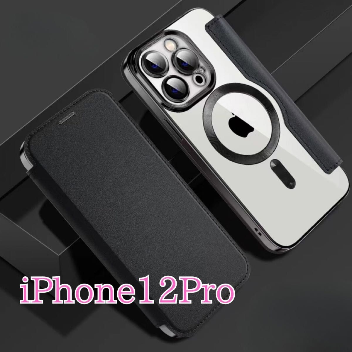 > iPhone12Proケース 手帳型 背面クリア MagSafe 黒 ブラック マグセーフ マグネット カード収納 iphone