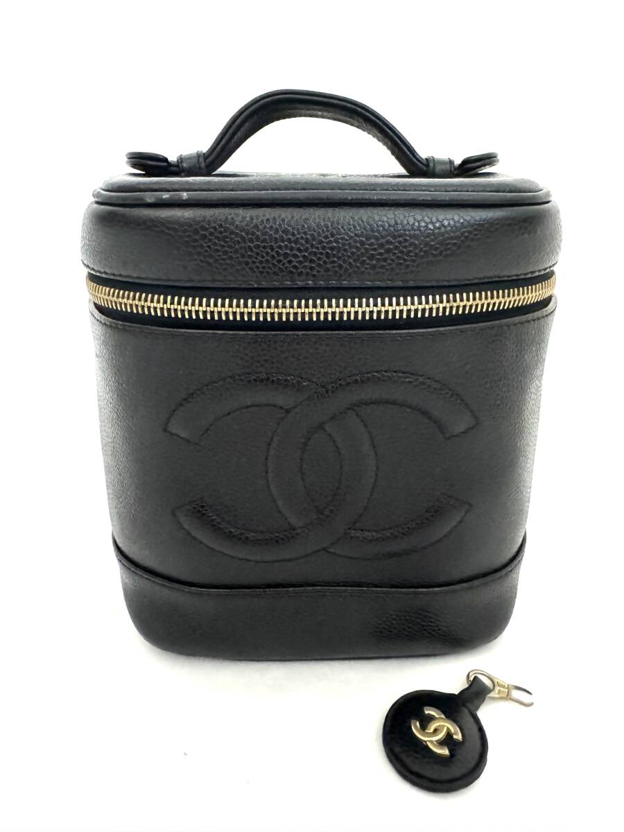 - 7H0314【本物保証】シャネル バニティ 縦型 ハンド バッグ 化粧 コスメ ポーチ キャビアスキン レザー ブラック ココマーク CHANEL