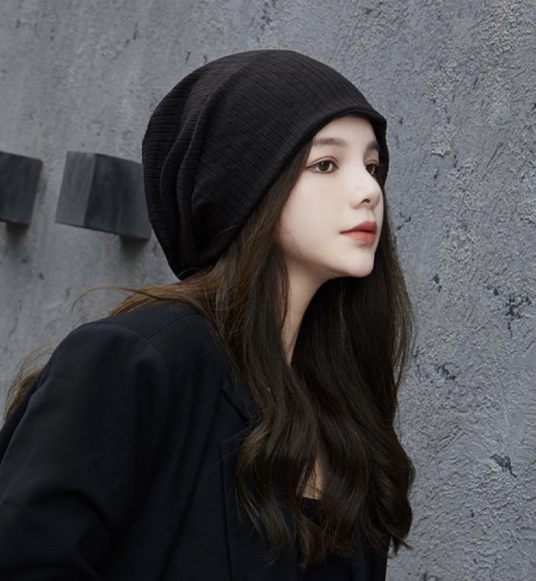 - 【新品】黒ニット帽付きウィッグ ロング ウェーブ ナチュラルブラック 耐熱 コスプレ かつら