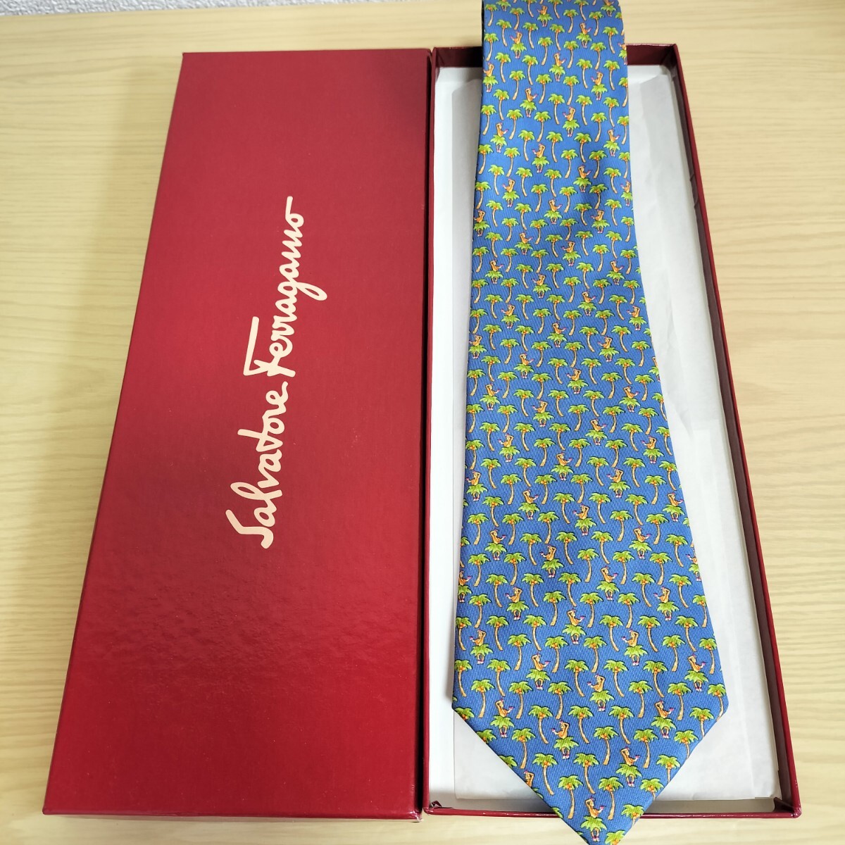 - Salvatore Ferragamo(サルヴァトーレフェラガモ)水色緑木人の模様ネクタイ