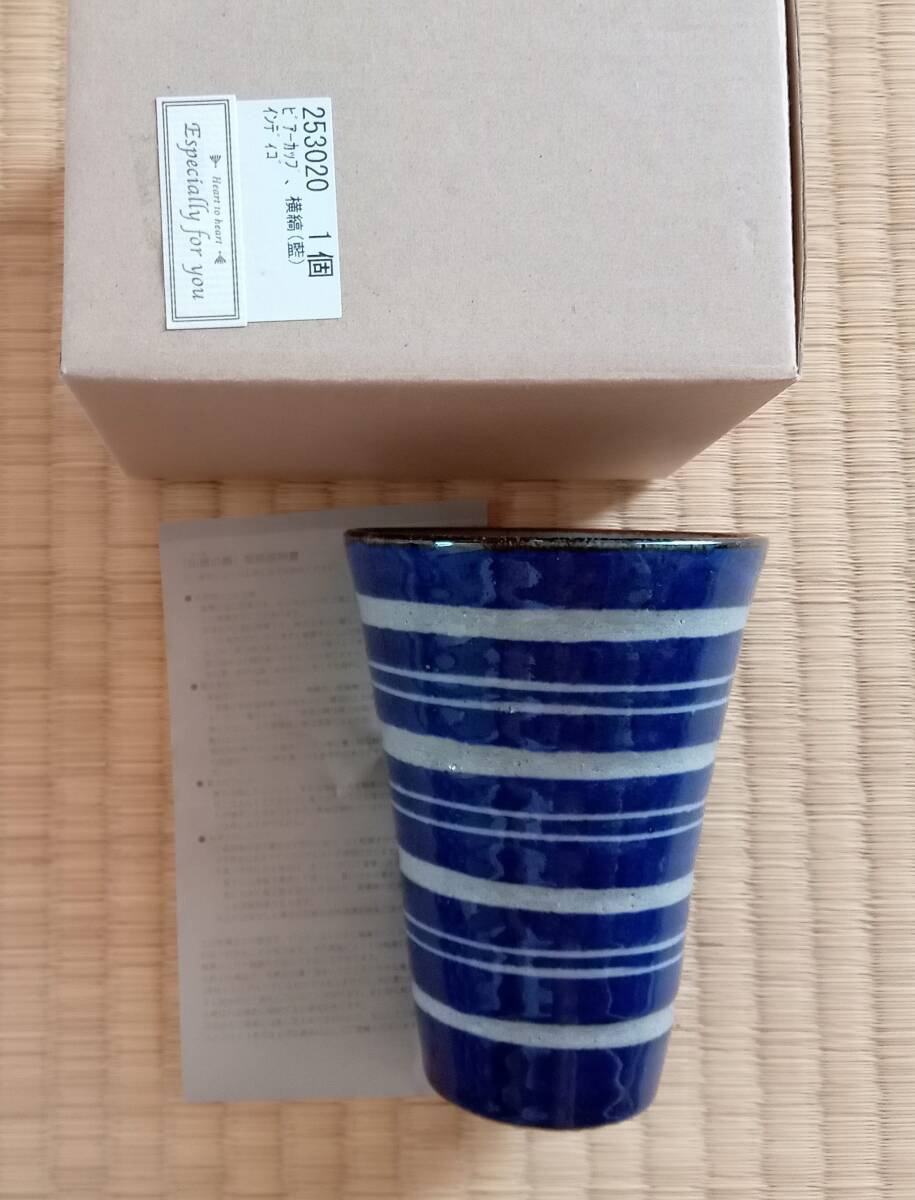 > ビアーカップ 日本製 陶器 インディゴ 横縞(藍) 口径 9.4cm 高さ 12.8cm 未使用 ビール おしゃれなビアグラス