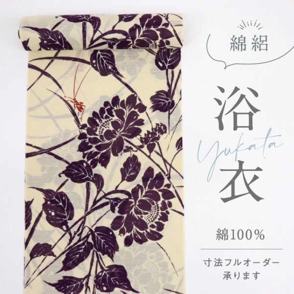 - 【反物】 浴衣 【綿絽】 向日葵と鈴虫 生成り色 木綿 夏着物 反25-60