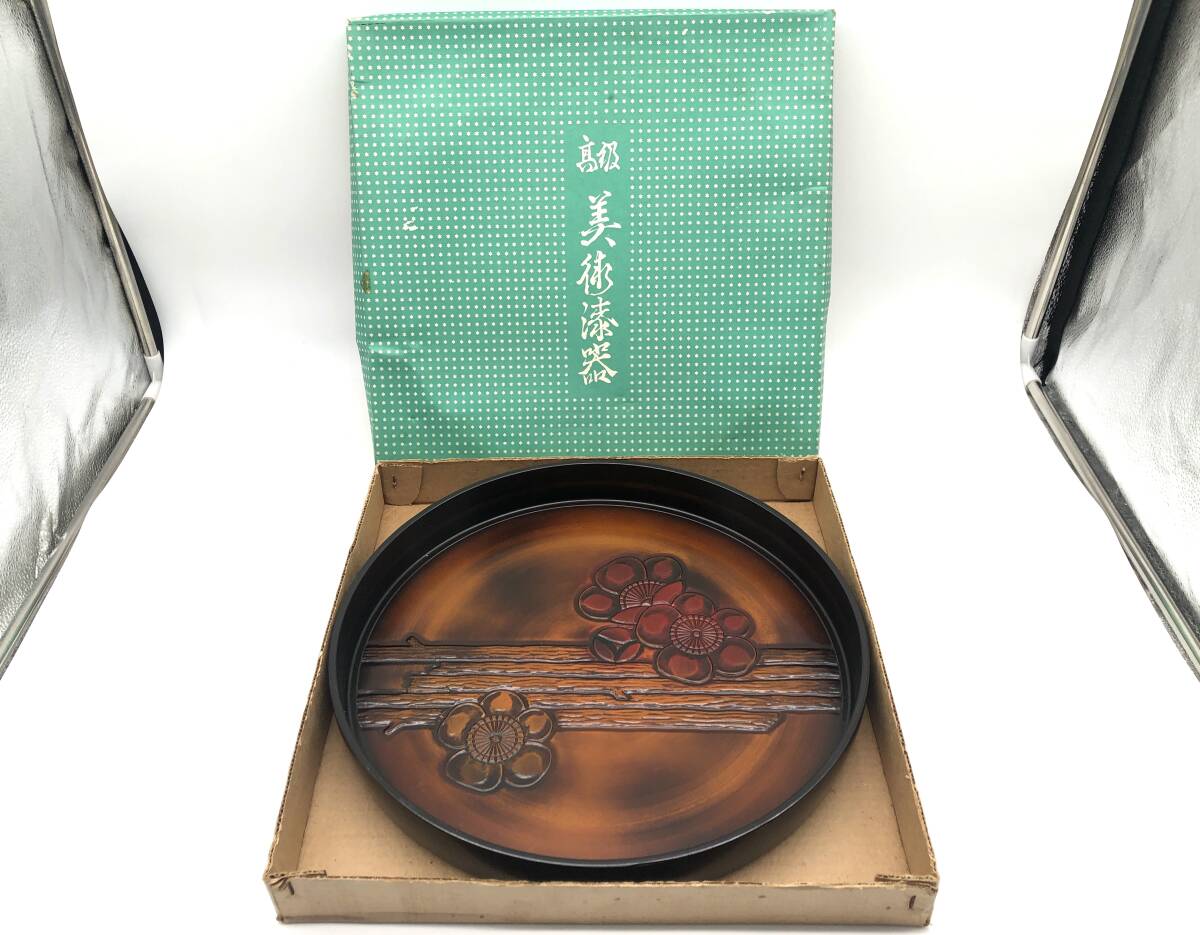 - 丸盆 紅梅 高級美術漆器 トレイ 贈答品 現状品