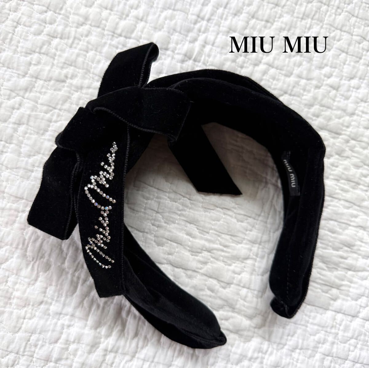 - 美品 MIUMIU ミュウミュウ レカチューシャ レディース ベルベット ベロア ロゴ リボン ヘアアクセサリー NERO 黒 ストーン スワロフスキー