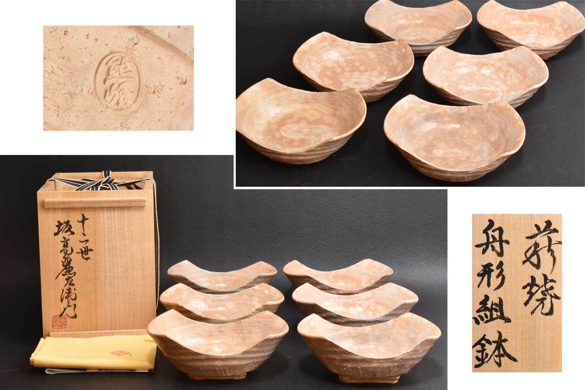 - 5931 十二世 坂高麗左衛門(熊峰)萩焼 舟形組鉢 6客 無キズ 共箱