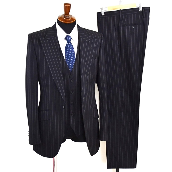 春秋対応。ベスト付き。1つボタンシングル。袖口4つ釦開き見せ。総裏地仕上げ。センターベント。フラップポケット。ネーム刺繍なし。肩幅狭いめ。袖丈長め。