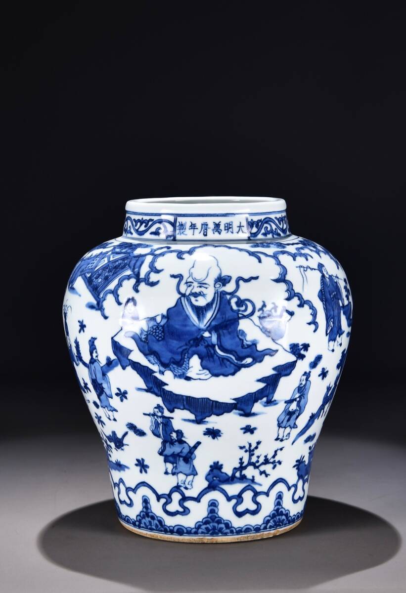> 【超珍館蔵】明 萬暦年製款 古陶瓷品 青花 群仙祝寿紋罐 陶藝 古賞物 古董品 古美術品 時代物 旧家蔵出 稀少珍蔵品