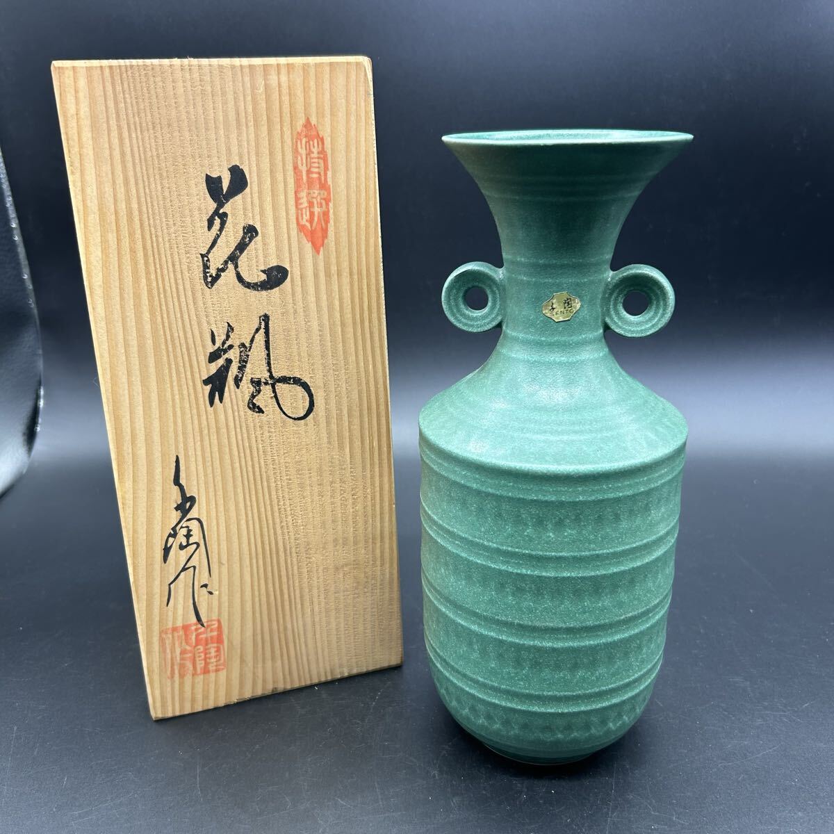 - SENTO 子陶 花瓶 花器 花入 緑色 取っ手付き 陶器 エ23