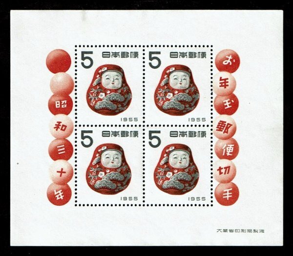 - N760■【糊落ち】1955年 年賀切手 加賀起き上がり 小型シート■未使用・良好