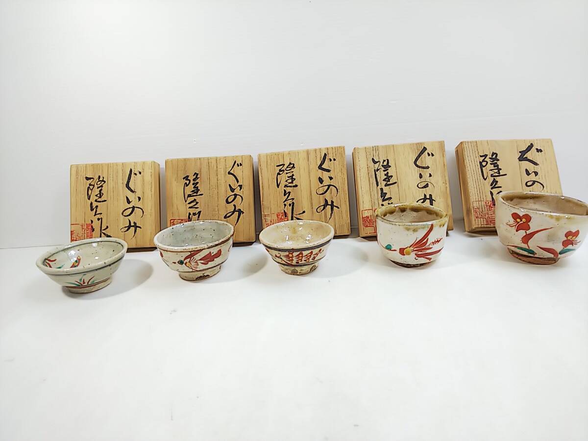 - 626 人気作家 古川隆久 作 赤絵ぐい呑 五点 5種絵替わり 盃 ぐい呑 各共箱付 セット
