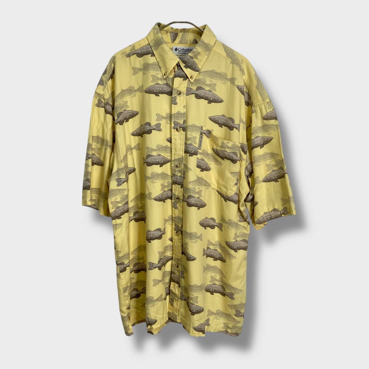 - 送料無料☆90s☆Columbia☆ブラックバス総柄半袖ボタンダウンシャツ☆L☆釣り好き用☆H25M