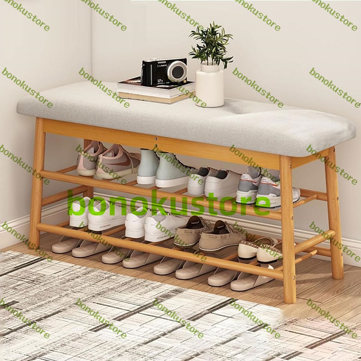 - ホームシューズチェンジングベンチ ベッドエンドベンチ 2層シューズラック付き 竹製収納コンパートメント 多機能シート 90 x 27 x 44 cm