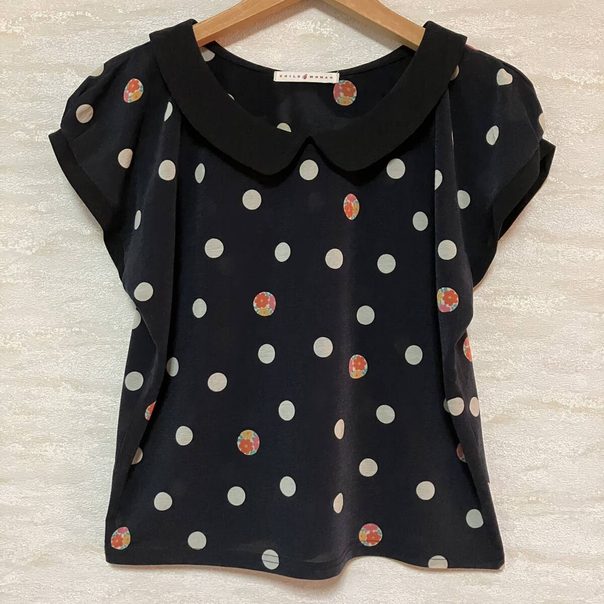 - CHILD WOMAN 丸襟付きプルオーバー(ブラック)花柄 in 水玉 フリーサイズ