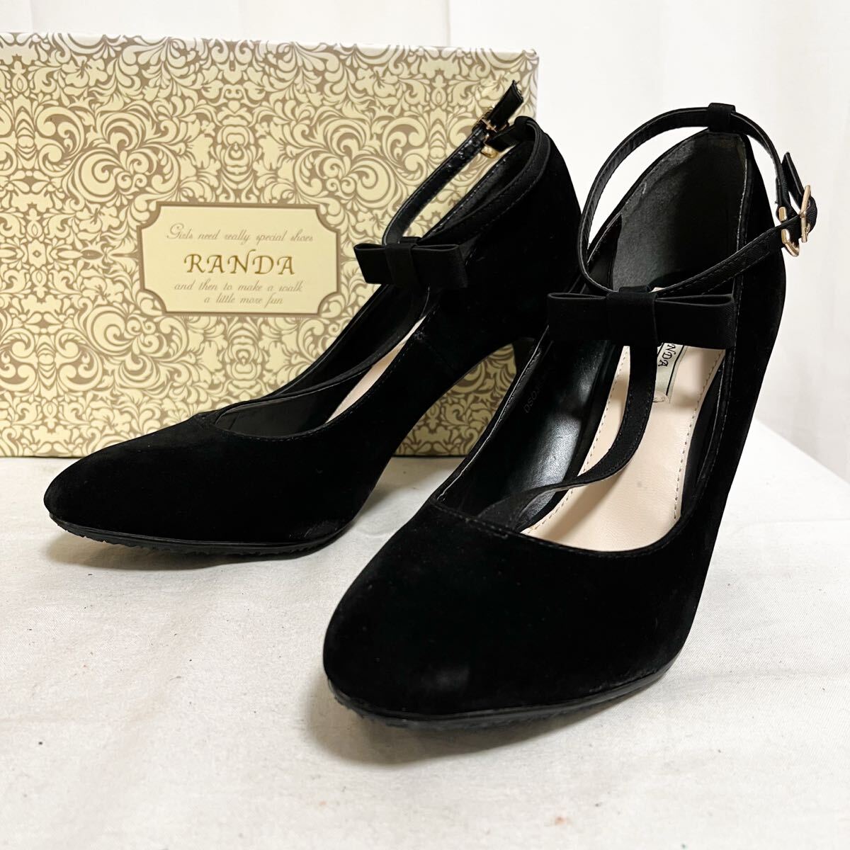 - 和818★ 箱付き RANDA ランダ パンプス ヒール ストラップ リボン L ブラック レディース ベロア調
