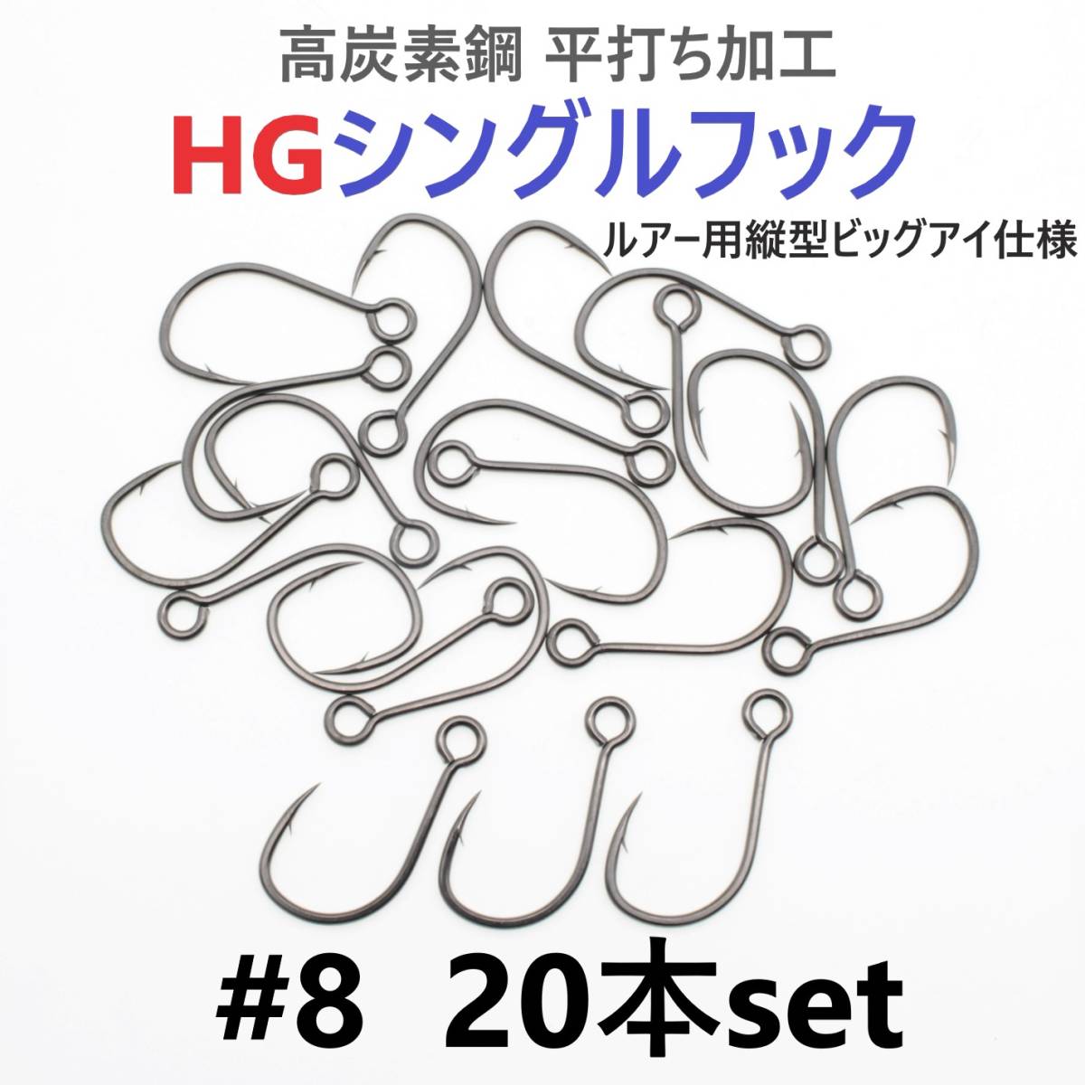 - 【送料無料】高炭素鋼 平打ち加工 ハイグレードシングルフック #8 20本セット ソルト対応 ブラックニッケルメッキ 縦アイ ビッグアイ仕様