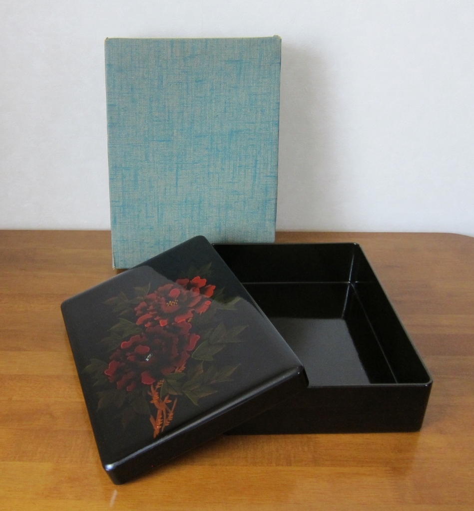 - 未使用 文箱 塗仕上げ 黒地にボタン柄 23×32×10 金文字入り 長期保管 擦れキズ有 小物入れ 保管箱