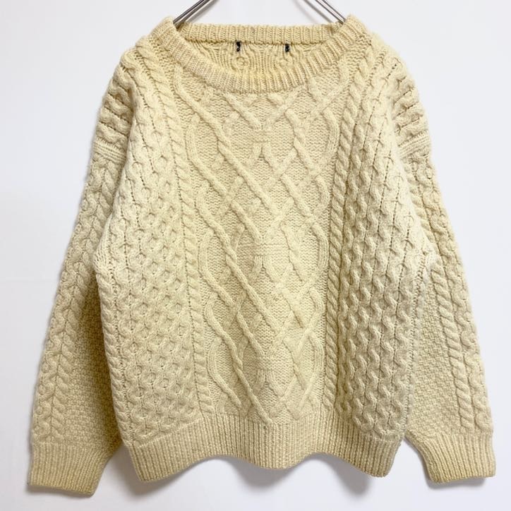 > 古着 used 80s 90s 長袖フィッシャーマン厚手ニット セーター アランニット クルーネック ケーブル編み 白 ホワイト
