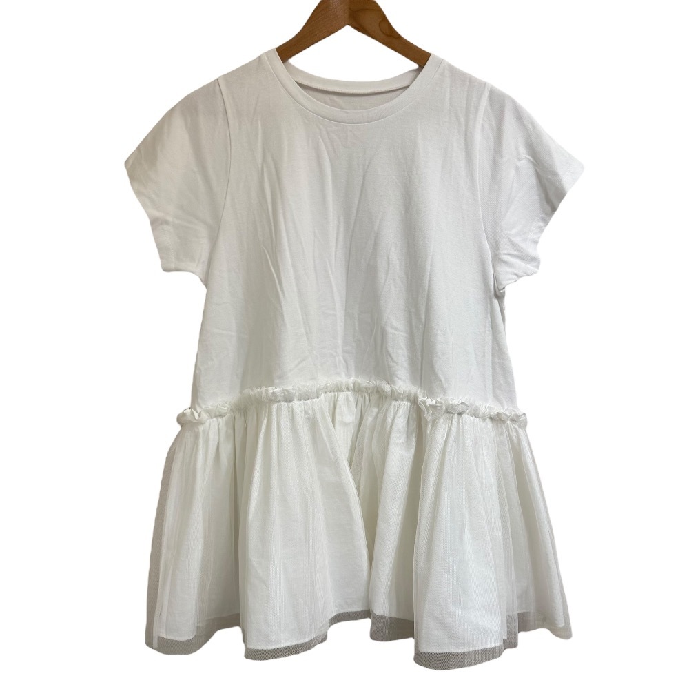 - 美品 THREE SQUARE スリースクエア 半袖 チュール切替 ペプラム フレア カットソー F ホワイト