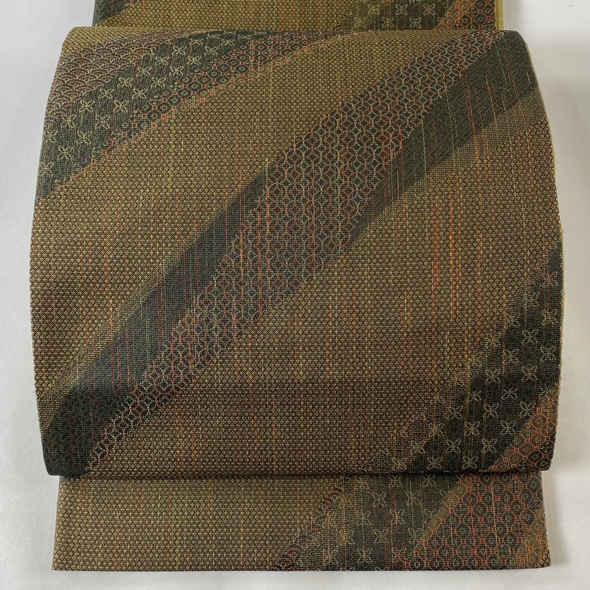 - 袋帯 美品 逸品 証紙 博多織 有職文様 幾何学 金糸 茶緑色 六通 正絹 【中古】