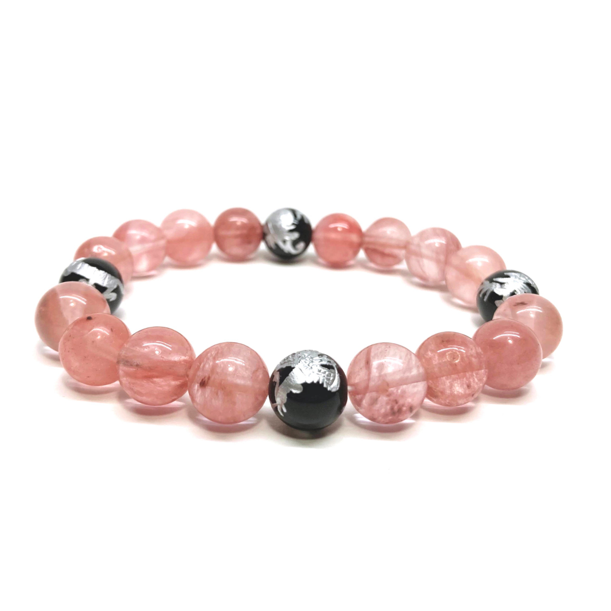 - 10mm 四神獣銀彫オニキス×チェリークォーツ パワーストーン ブレスレット 運気上昇 開運 金運 恋愛運 青龍 白虎 玄武 朱雀 ☆