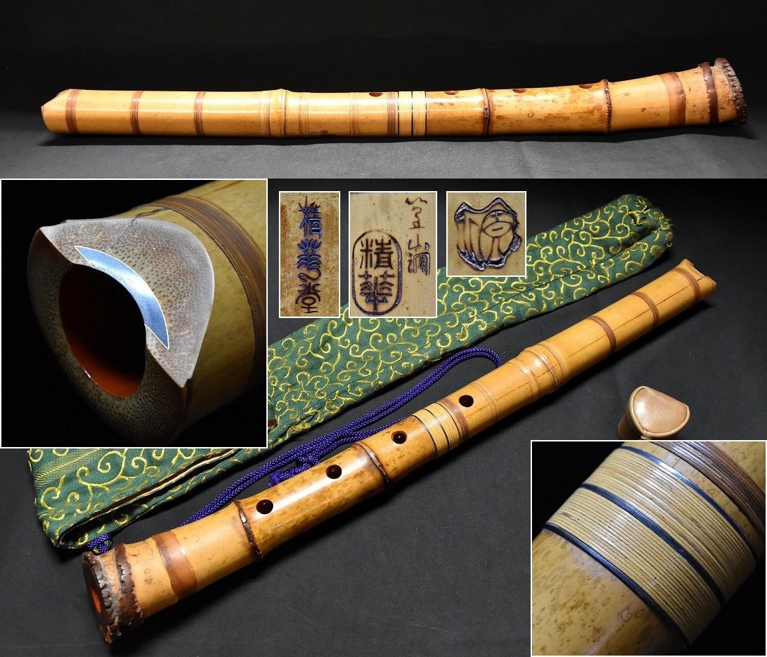 > 都山流尺八 金縁歌口 極上管【北原精華・四印】銀三線籐巻2つ折 1尺8寸管 袋・キャップ付 時代和楽器