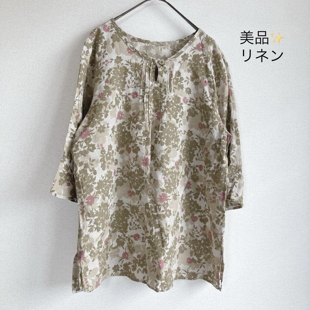 - 美品リネン 麻 ピンタックブラウス 花柄 六分袖 フレアスリーブ 日本製