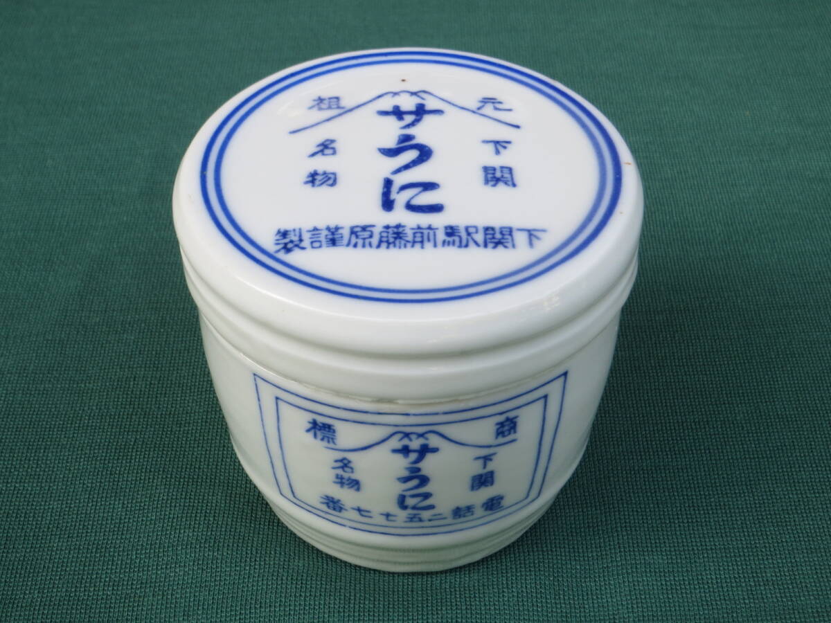- 印版 磁製容器 下関うに容器 下関駅前藤原謹製 昭和前期