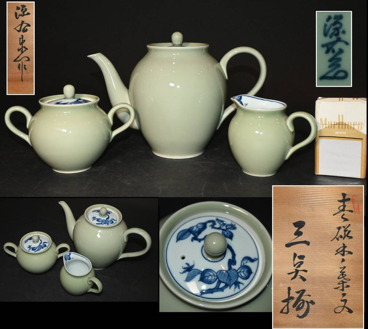 > ティファニー×館林源右衛門窯【Tiffany 源】青磁 木ノ葉文 三点揃 未使用品 共箱 ポット・ミルク入・砂糖入 コラボ Wネーム 洋食器 茶道具