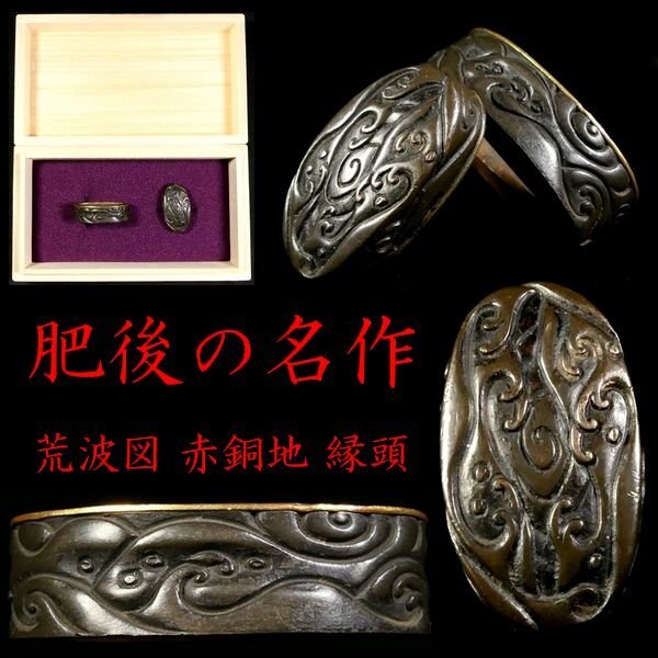 > 【 恵 #1801 】 肥後の優品 力強き細工の荒波図 赤銅地 縁頭 金色絵 見応えある一品です! 検:鍔/切羽/刀剣/刀装具