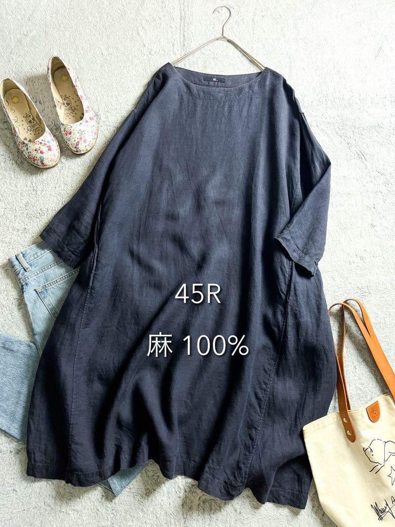 - 【45R】45rpm リネンオックスフォードワンピース ボートネック インディゴ