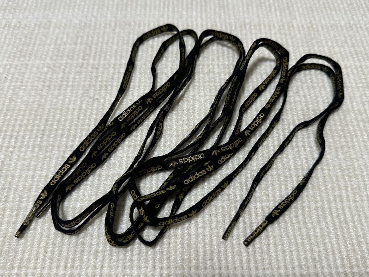 - 新品 未使用 アディダス adidas 靴紐 ひも シューレースブラック 黒 ゴールド 金 文字 ロゴ 約150cm スーパースター スタンスミス