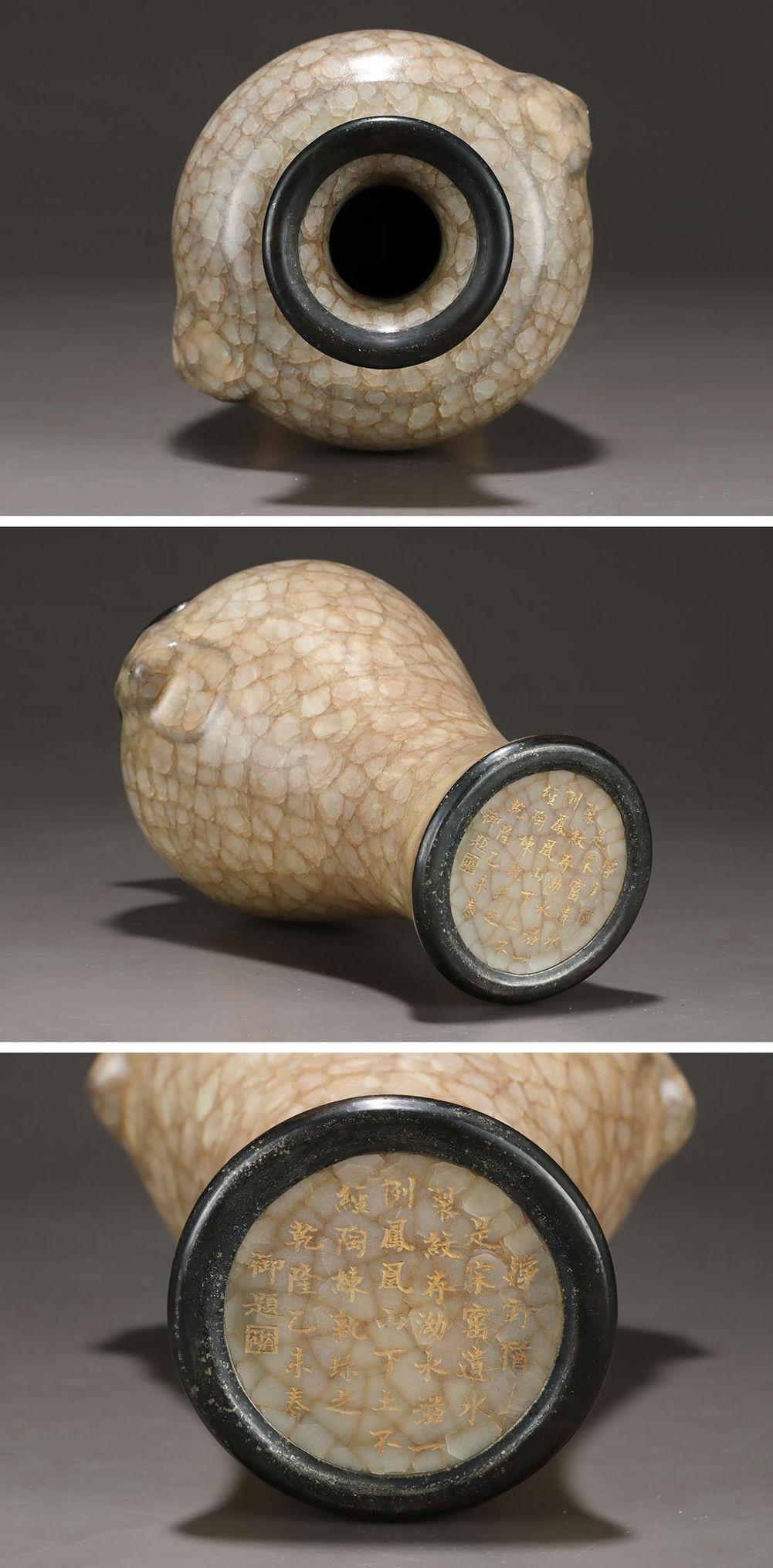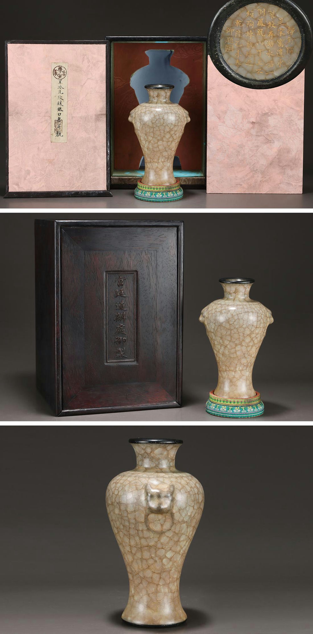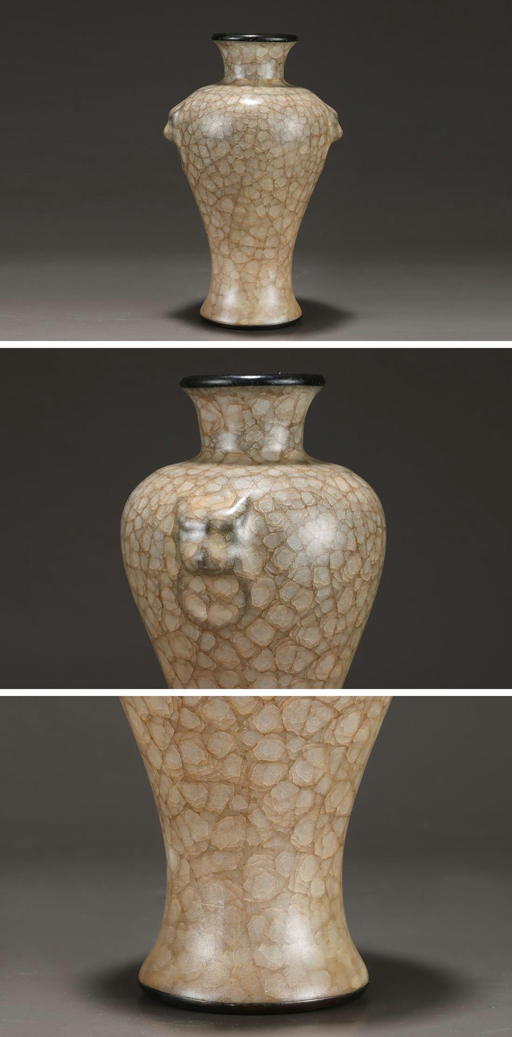 - ■観心・時代旧蔵■G9000清宮 宋時代 官窯米黄釉氷片象嵌銀扣獣耳瓶・古陶磁器 ・珍品旧蔵・古賞物・時代物