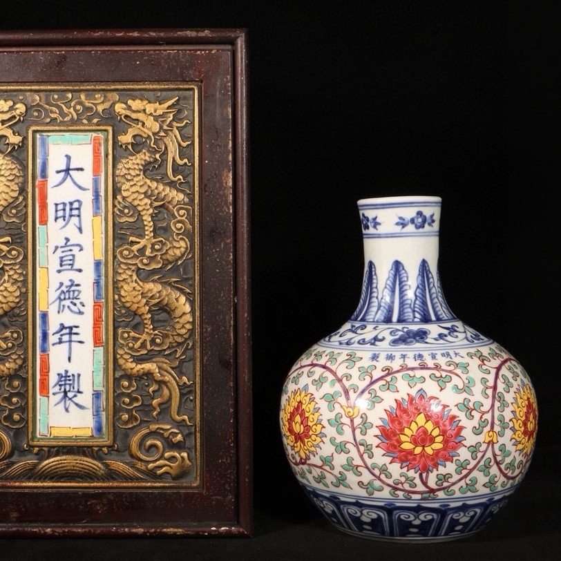 - 珍しい 唐物 中国 明時代 宣徳年製 五彩纏枝蓮 天球瓶 古染付 中国美術 骨董 古美術 819