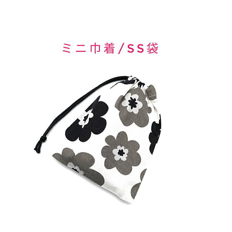 > ミニ巾着袋・SS袋【北欧風 ポップフラワー柄 ホワイト×ブラック】マチ無し 巾着 ポーチ お菓子袋 小物入れ 小さい袋 プレゼント 花柄